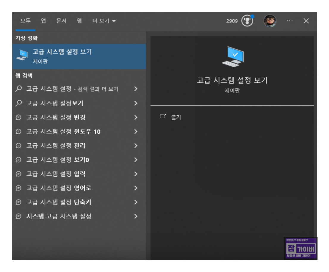 작업 표시줄 검색창에 "고급 시스템"을 입력하고 [고급 시스템 설정]을 실행합니다.