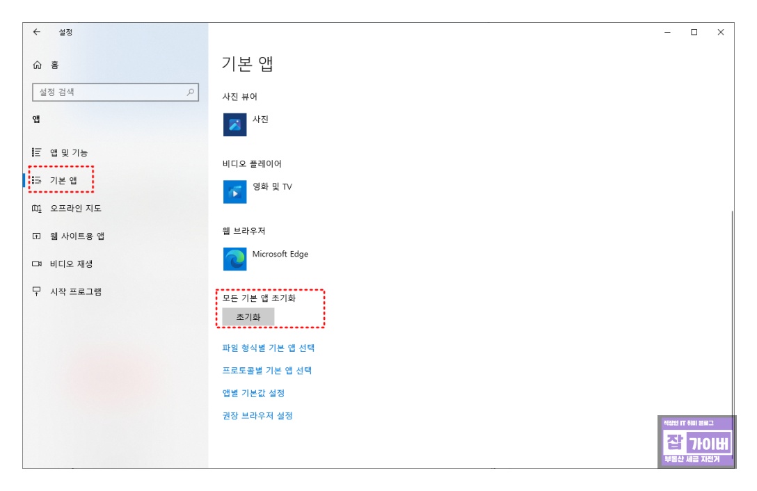 [앱]을 선택 후 좌측 메뉴에서 [기본 앱]을 선택한 후 우측 화면에서 [Microsoft 권장값으로 초기화]에 있는 [초기화] 버튼을 클릭합니다.