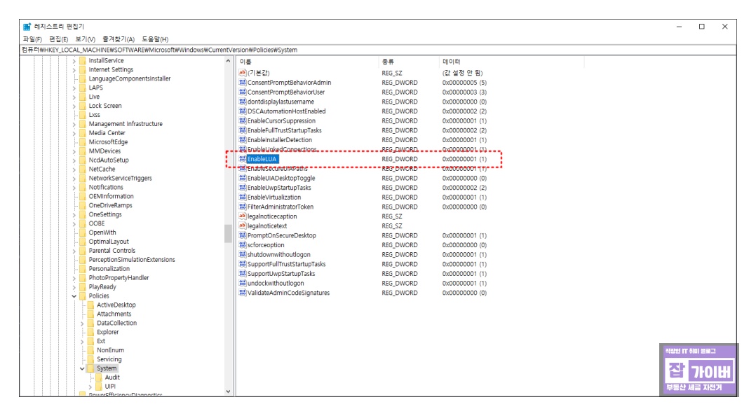 해당 폴더에서 [EnableLUA]를 더블클릭 후 값 편집 창이 열리면 값을 "1"로 입력합니다.