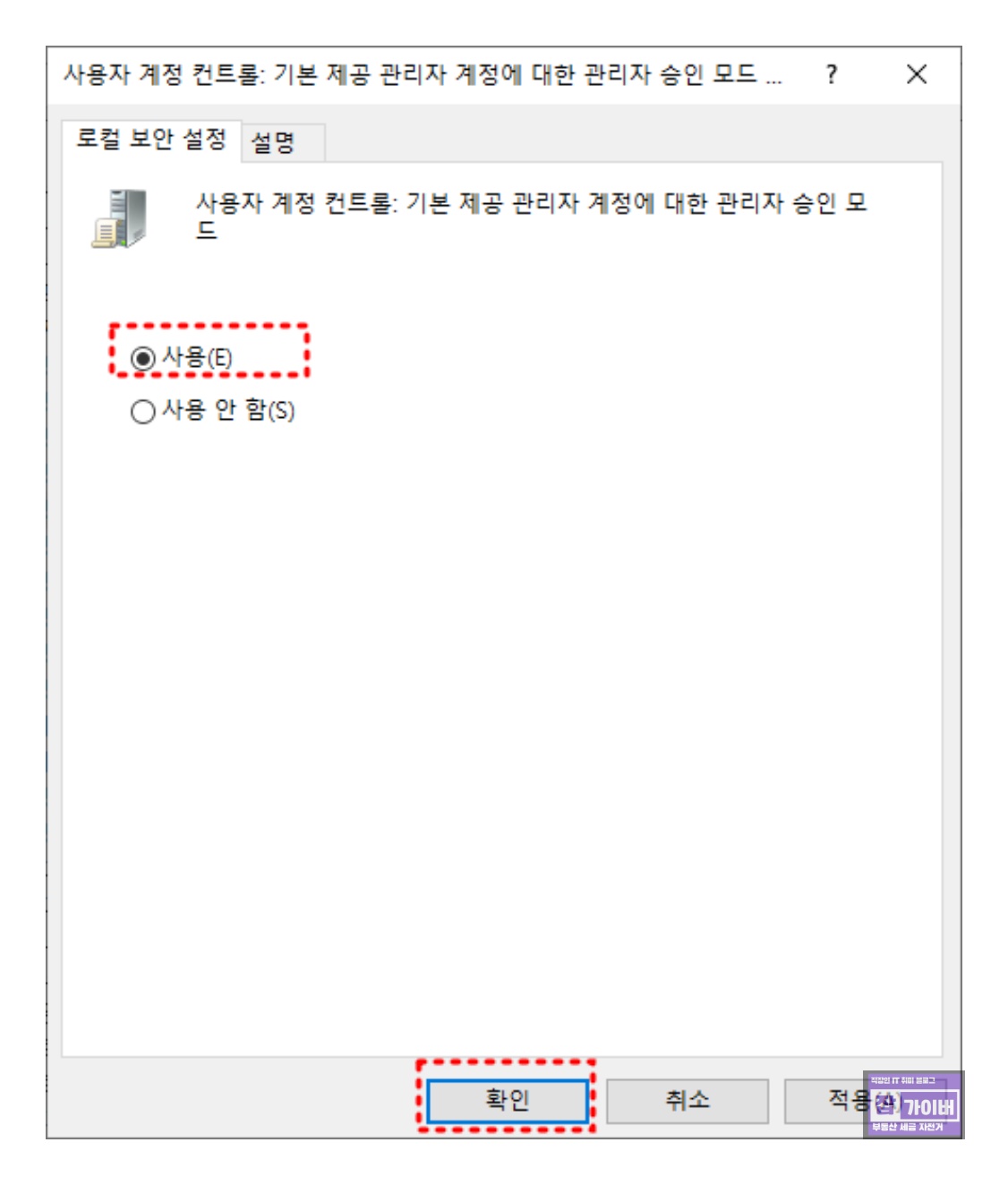 속성 창이 열리면 [사용]을 선택하고 [확인] 버튼을 클릭합니다.