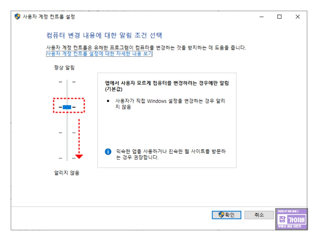 [사용자 계정 컨트롤 설정 변경]을 선택 후 사용자 계정 컨트롤 설정 창이 열리면 알림을 가장 아래로 이동하여 알림 비허용으로 체크한 다음 [확인] 버튼을 클릭합니다.