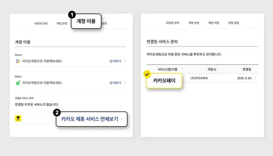 - 카카오페이 앱 접속 → ‘설정’ → ‘계정관리’ → ‘탈퇴’ 선택