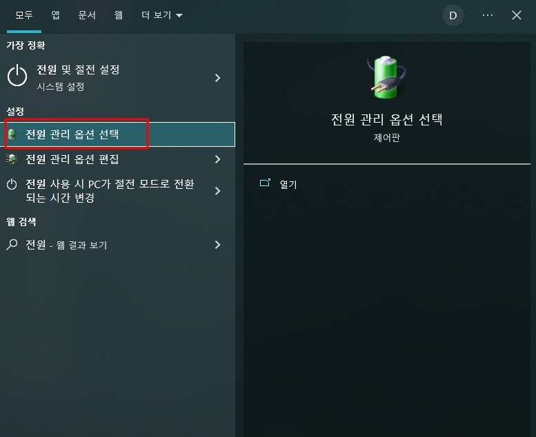- 작업 표시줄의 돋보기 아이콘을 클릭하고 "전원 및 절전 설정"을 검색하여 설정 메뉴로 접근합니다.