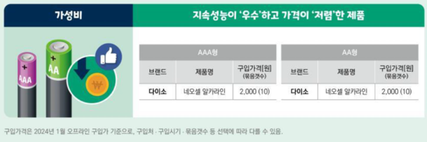 다이소의 네오셀 AAA형 건전지는 최대 8.6배, AA형 건전지는 최대 7.1배의 지속시간을 보여 가격 대비 성능이 우수했습니다.