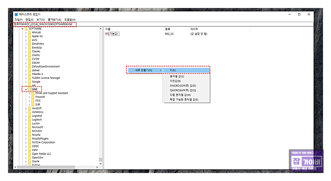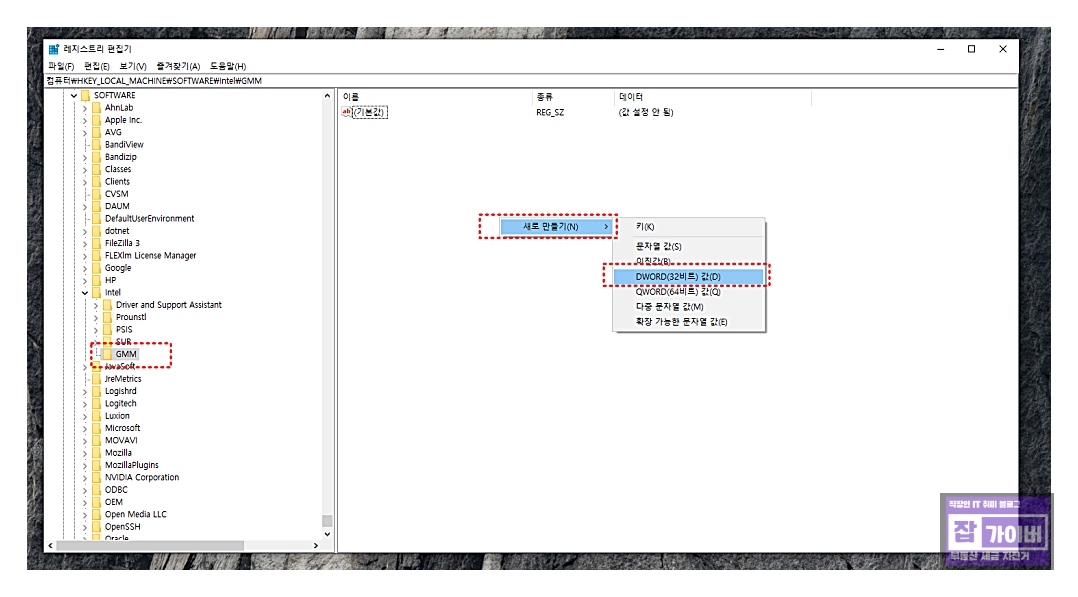 Intel 키를 마우스 오른쪽 버튼으로 클릭하고 새로 만들기(N) > 키(K)를 선택 후 이름을 GMM으로 지정합니다.