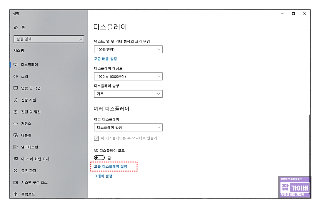 화면 하단에 있는 "디스플레이 1의 어댑터 속성을 표시"를 클릭합니다.