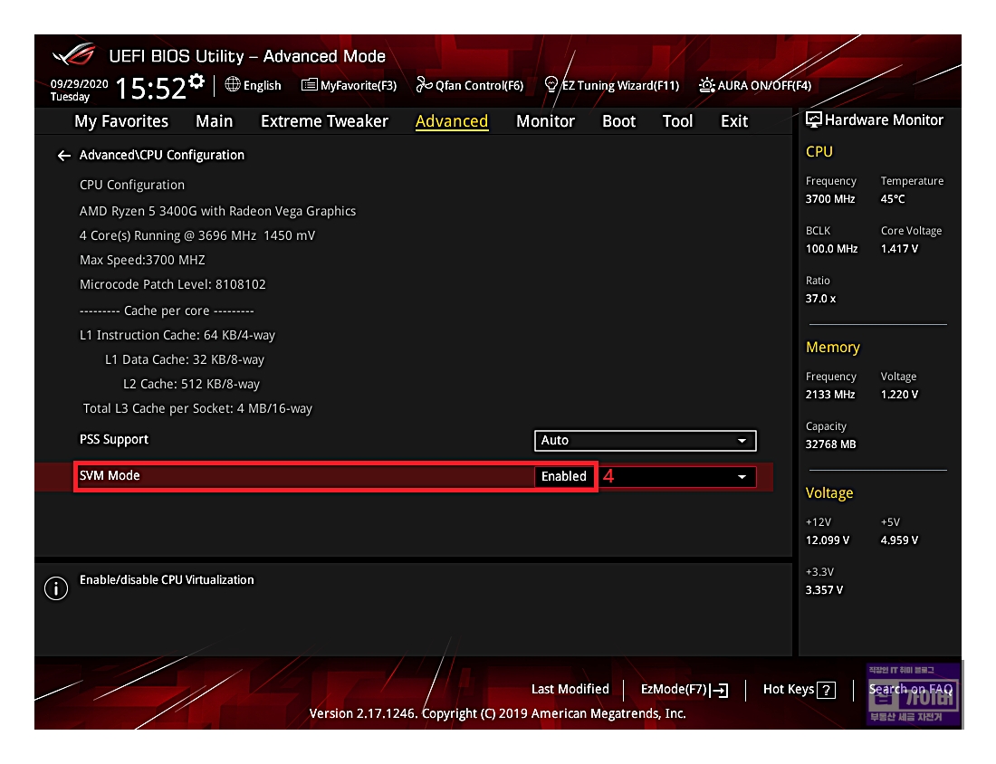 아수스 라이젠 CPU 가상화 메인보드 활성화 SVM Mode 설정방법