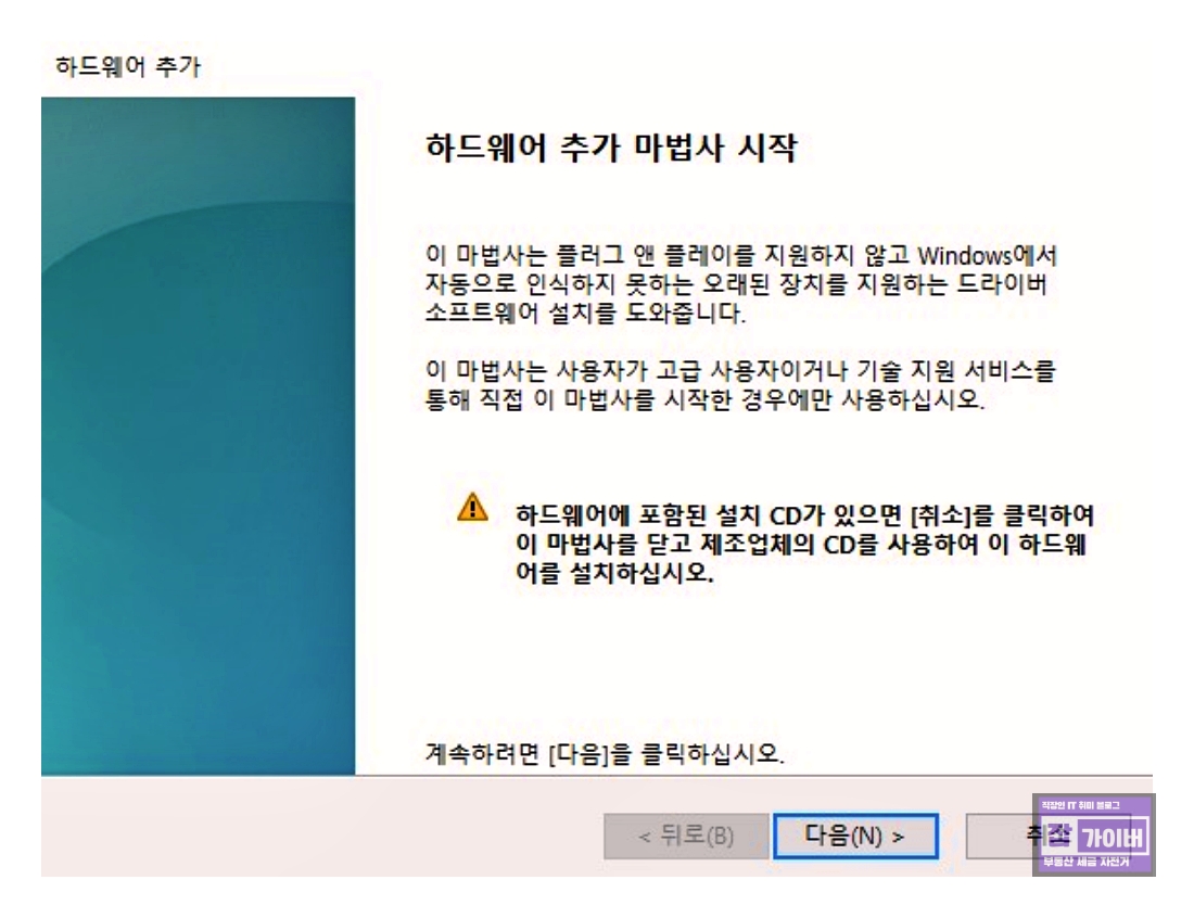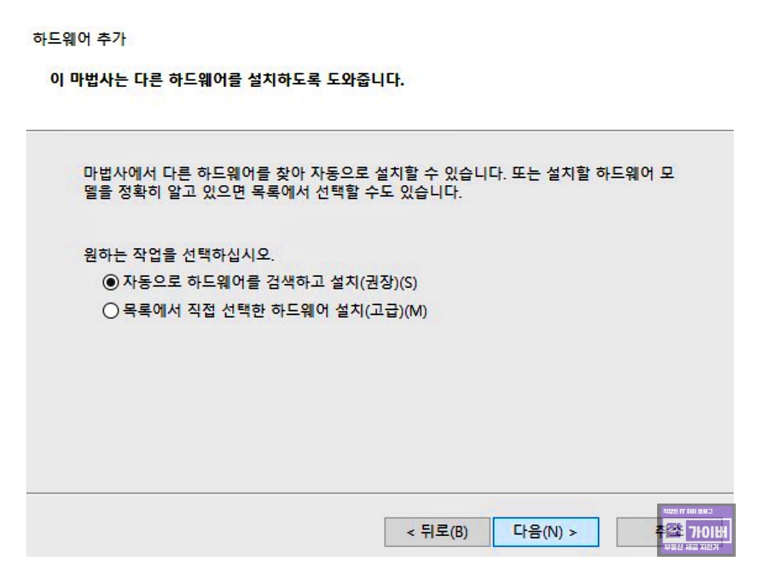 "하드웨어 추가 마법사 시작" 화면에서 "다음"을 클릭합 후 "자동으로 하드웨어를 검색하고 설치(권장)" 항목을 선택한 후 "다음"을 클릭합니다. "모든 장치 표시"를 선택한 후 "다음"을 클릭합니다.