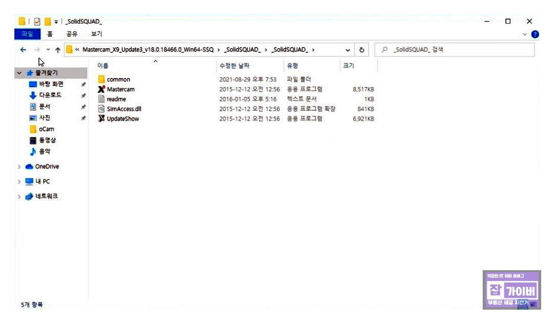 업데이트가 완료되면 업데이트 3 폴더 내 "SolidSQUAD" 폴더에 있는 모든 파일을 복사하여 C 드라이브의 Program Files 폴더 내 mcamX9 폴더에 붙여넣기 합니다.
