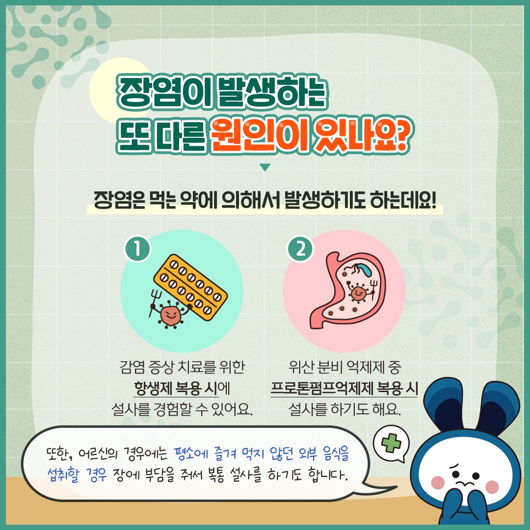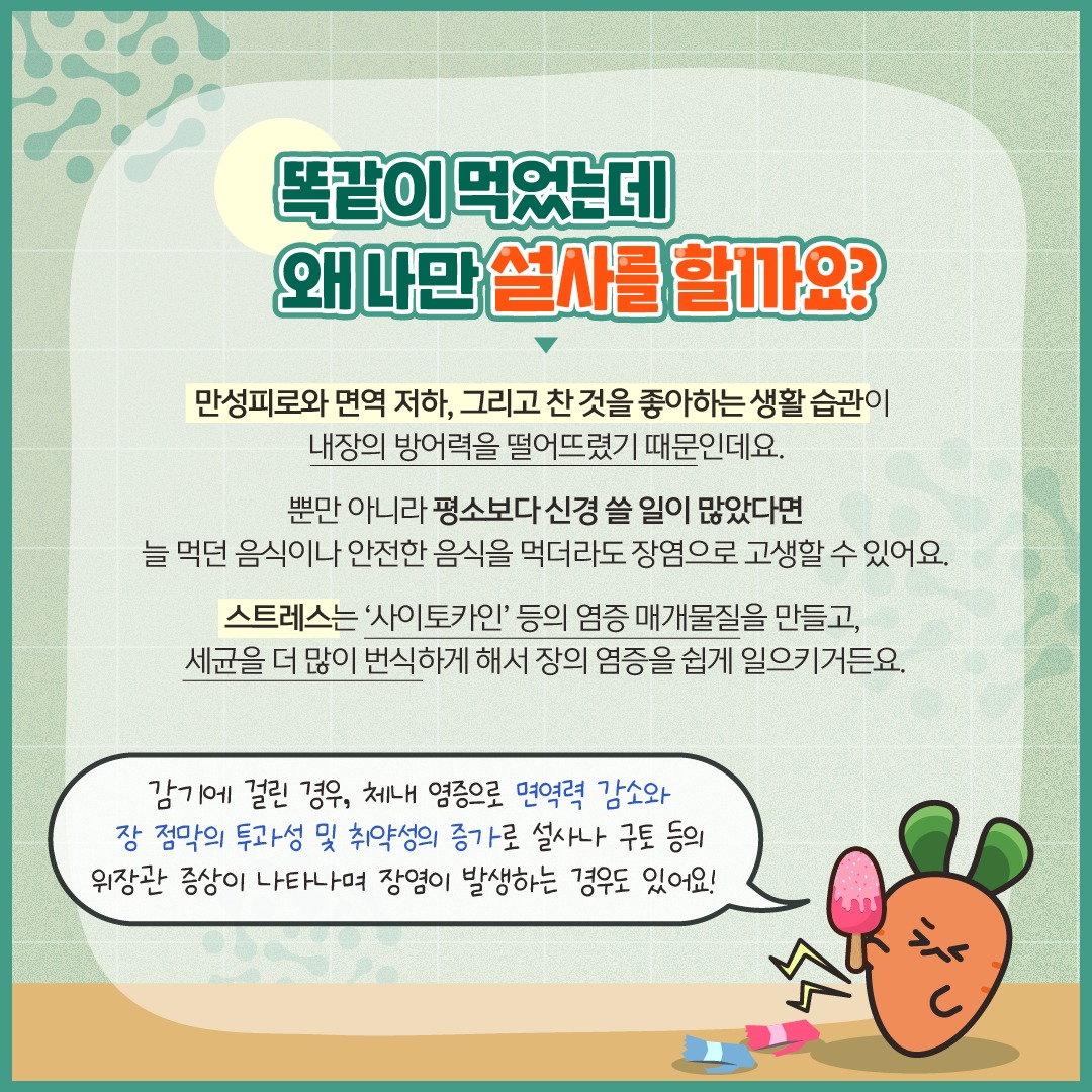 - 원인: 장내 세균이나 바이러스가 장벽을 자극하고 염증을 일으키기 때문입니다.