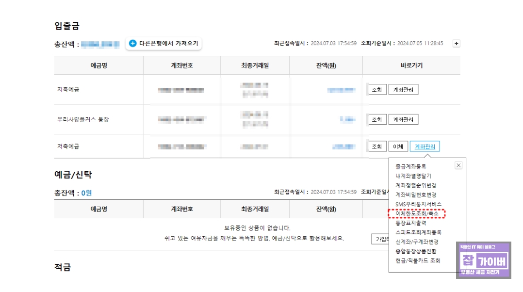 • 계좌조회/관리 → 계좌관리 → 이체한도관리를 차례대로 클릭합니다.