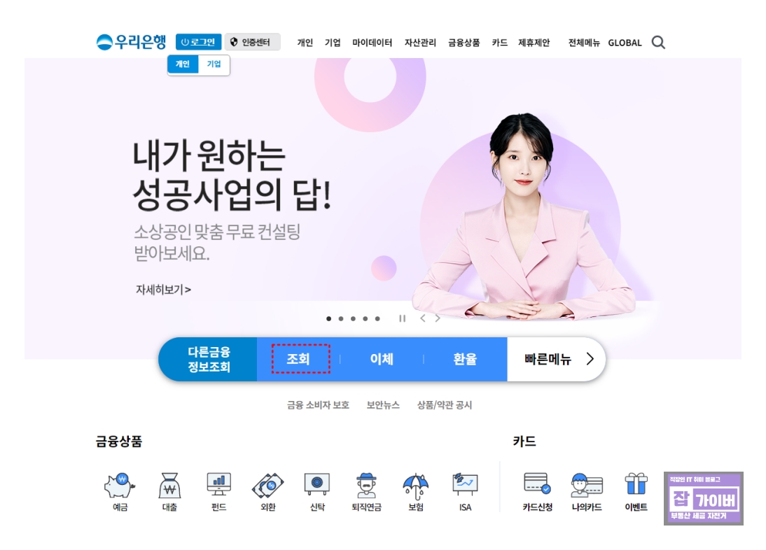 핸드폰 앱이 없다면 인터넷을 통해 우리은행 홈페이지에 접속 후 본인 금융인증서 로그인합니다.