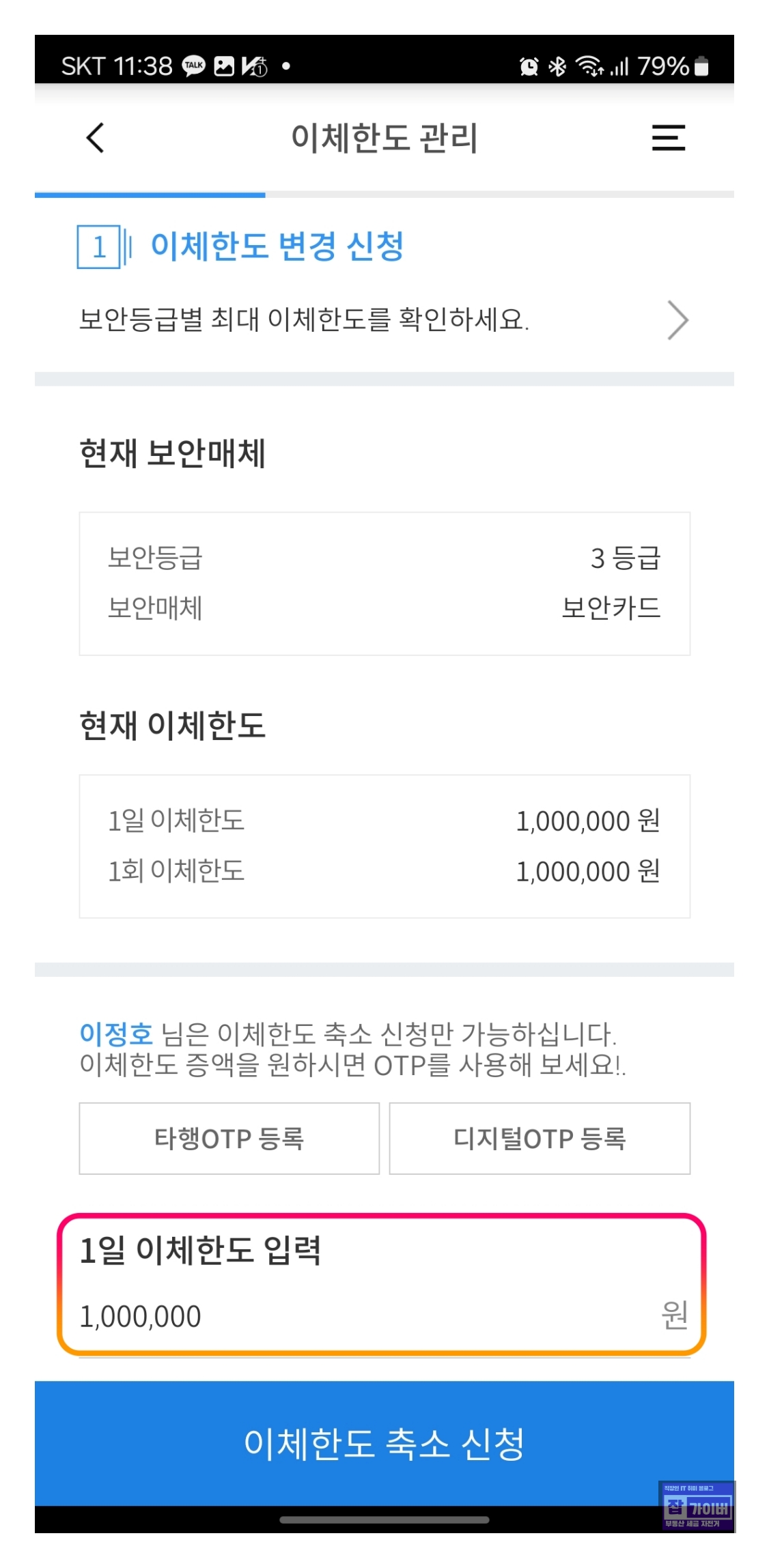 저 같은 경우 보안등급 3등급으로 1회 천만원 1일 최대 5천만원으로 이체한도가 제한됩니다.
