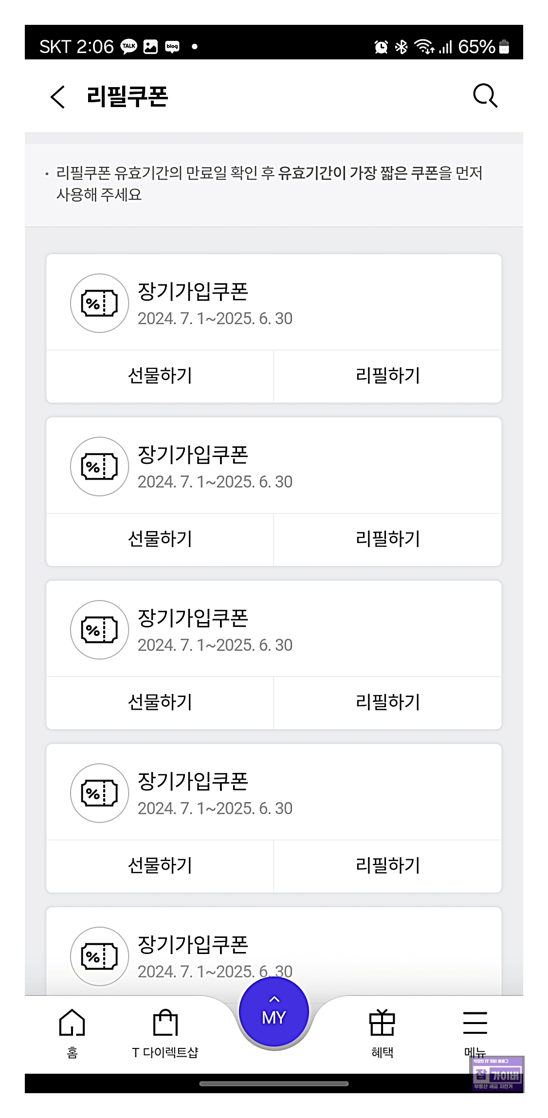 여기서 현재 사용 가능한 리필쿠폰과 T데이터 쿠폰을 등록할 수 있습니다.