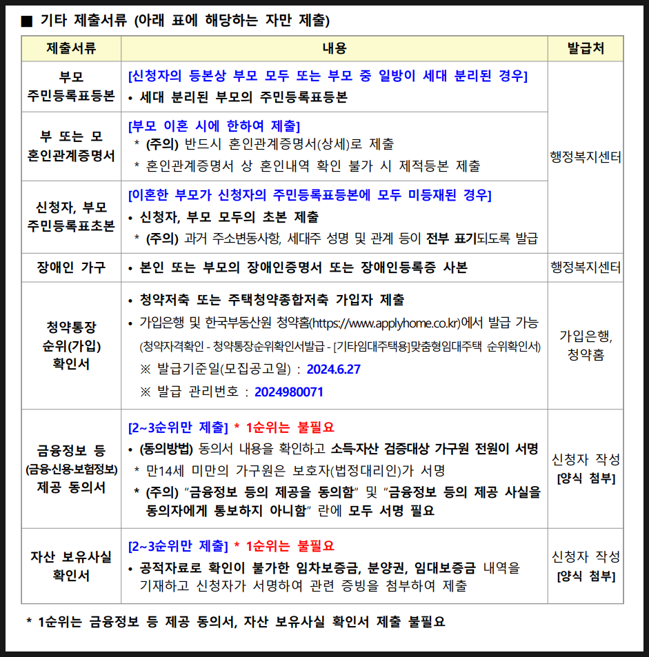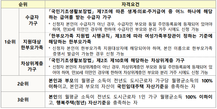 • 2순위: 본인과 부모의 월평균 소득이 전년도 도시근로자 가구당 월평균소득의 100% 이하, 국민임대 자산기준 충족