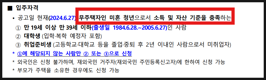 • 무주택자인 미혼 청년으로서 소득 및 자산 기준을 충족하는 만 19세 이상 만 39세 이하인 사람