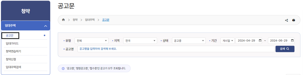 • 3. 유형과 지역, 공고명을 이용하여 모집 공고 확인