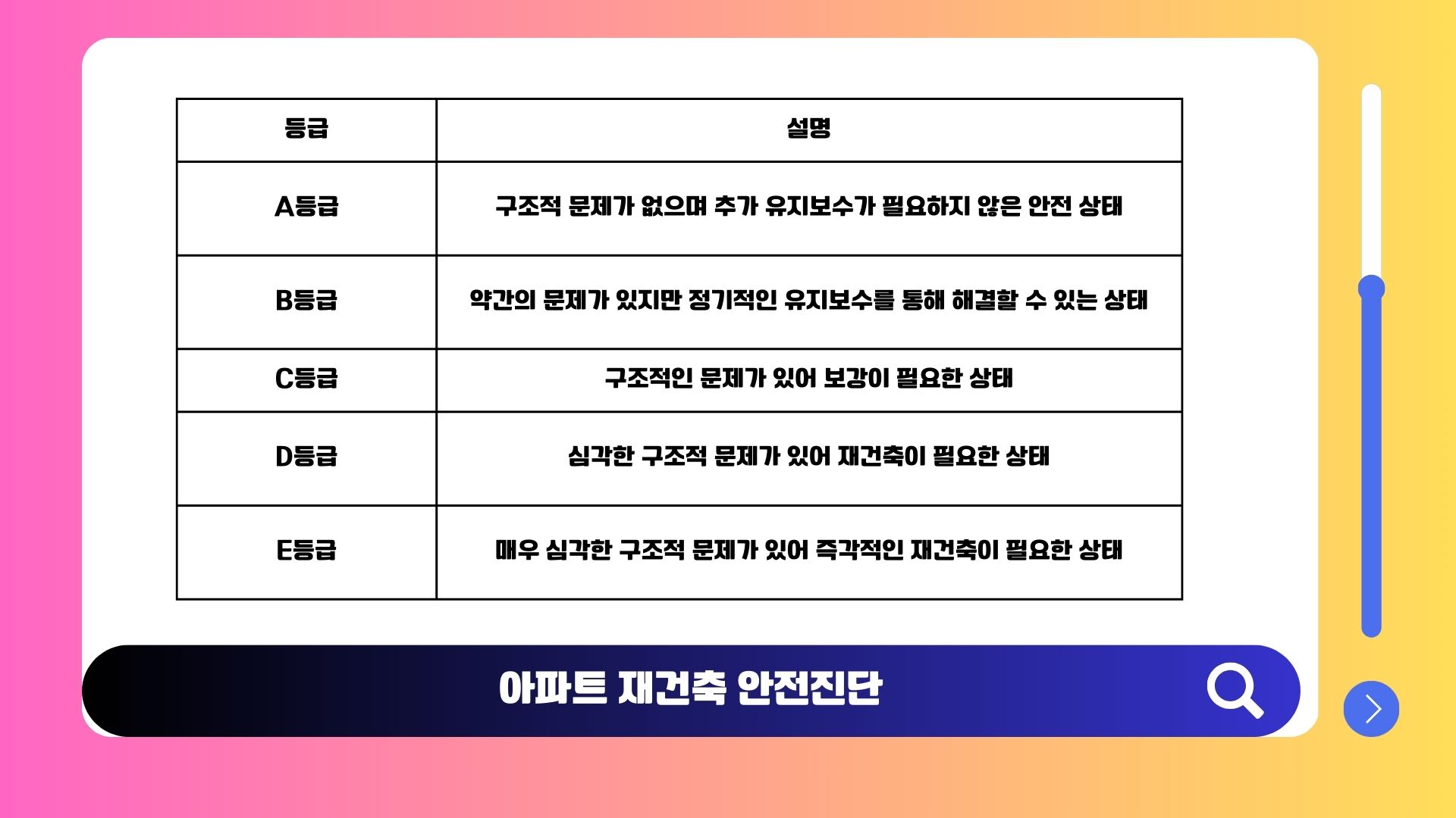- E등급: 매우 심각한 구조적 문제 있음, 즉각적인 재건축 필요