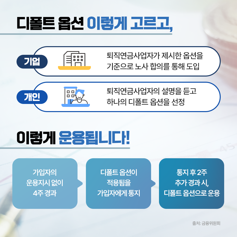 디폴트 옵션은 사용자의 퇴직연금을 보다 효과적으로 운용하기 위해 도입된 제도입니다.