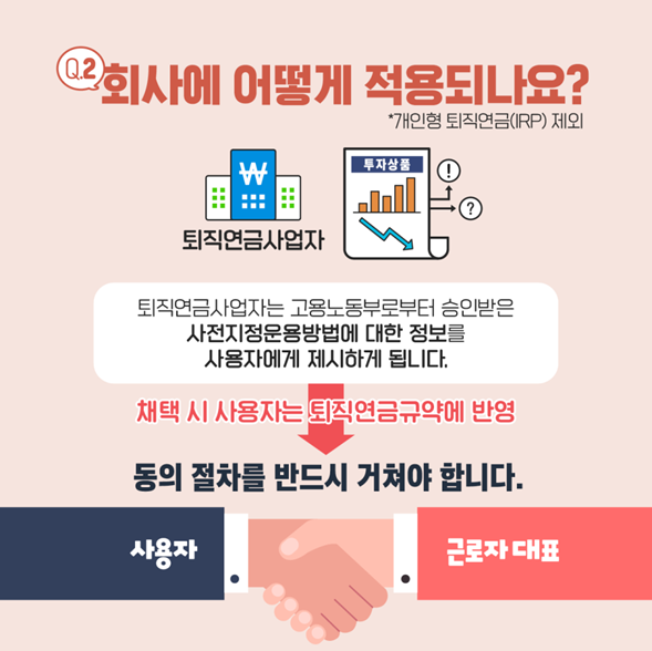 - 정보 제공: 퇴직연금 사업자가 사전 지정 운용방법에 대한 주요 정보를 회사 측에 제시합니다.