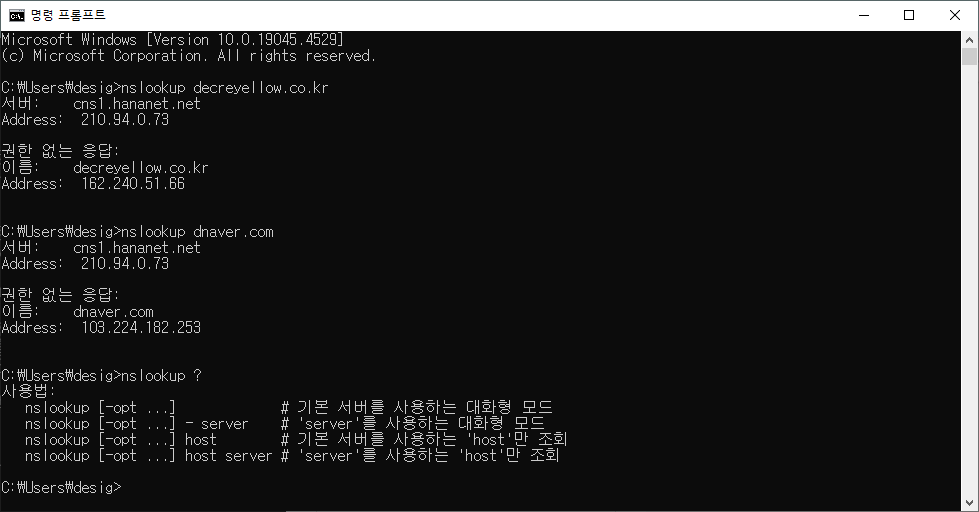 그래서 워드프레스나 그누보드 등 다양한 웹사이트를 제작 후 도메인 문제나 네트워크 문제를 해결할 때, nslookup 명령어로 DNS 설정을 확인하고 진단할 수 있습니다.