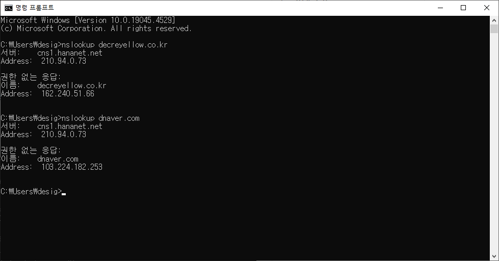 - nslookup 명령어 입력: nslookup [도메인명]을 입력하고 엔터를 누르면 설정된 DNS 서버에 질의하여 해당 도메인의 IP 주소를 조회합니다.