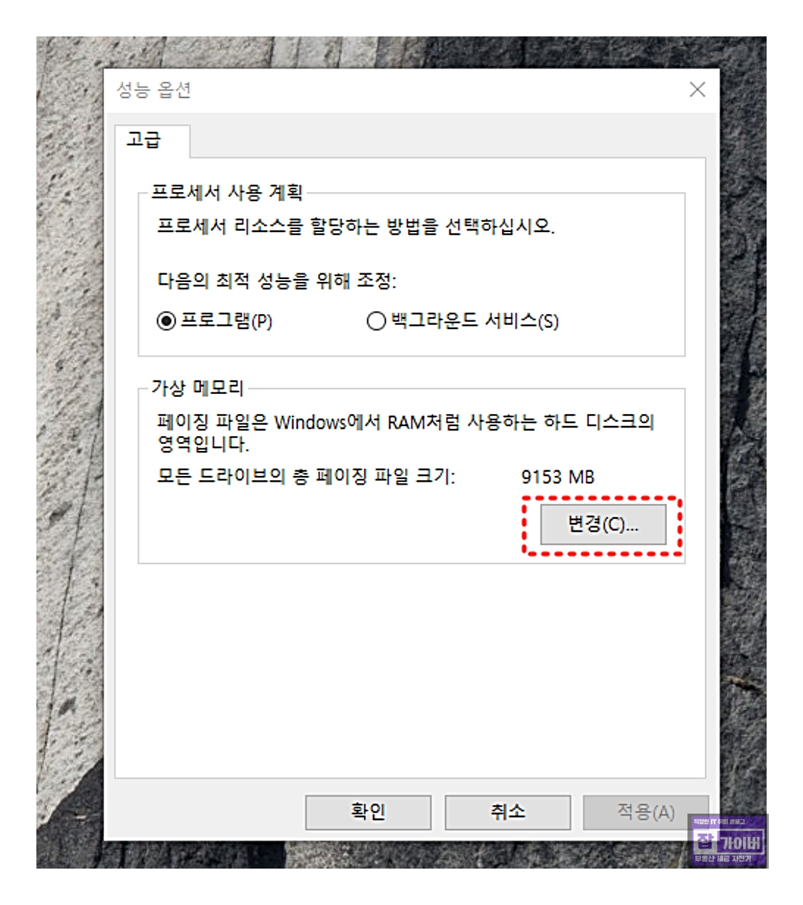 성능 옵션 창에서는 다시 고급 탭으로 이동한 뒤, 아래쪽에 있는 가상 메모리 영역의 변경 버튼을 누릅니다. 이 부분이 바로 페이징 파일 크기를 조정하는 설정입니다.