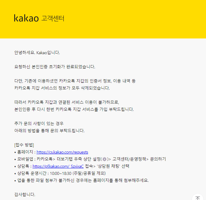그리고 이 과정에서 특정 카카오 서비스의 탈퇴가 필요할 수 있기 때문에 카카오톡 본인인증 초기화 및 탈퇴 서류가 필요하며 해당 서류는 위 첨부파일을 다운로드 받으세요