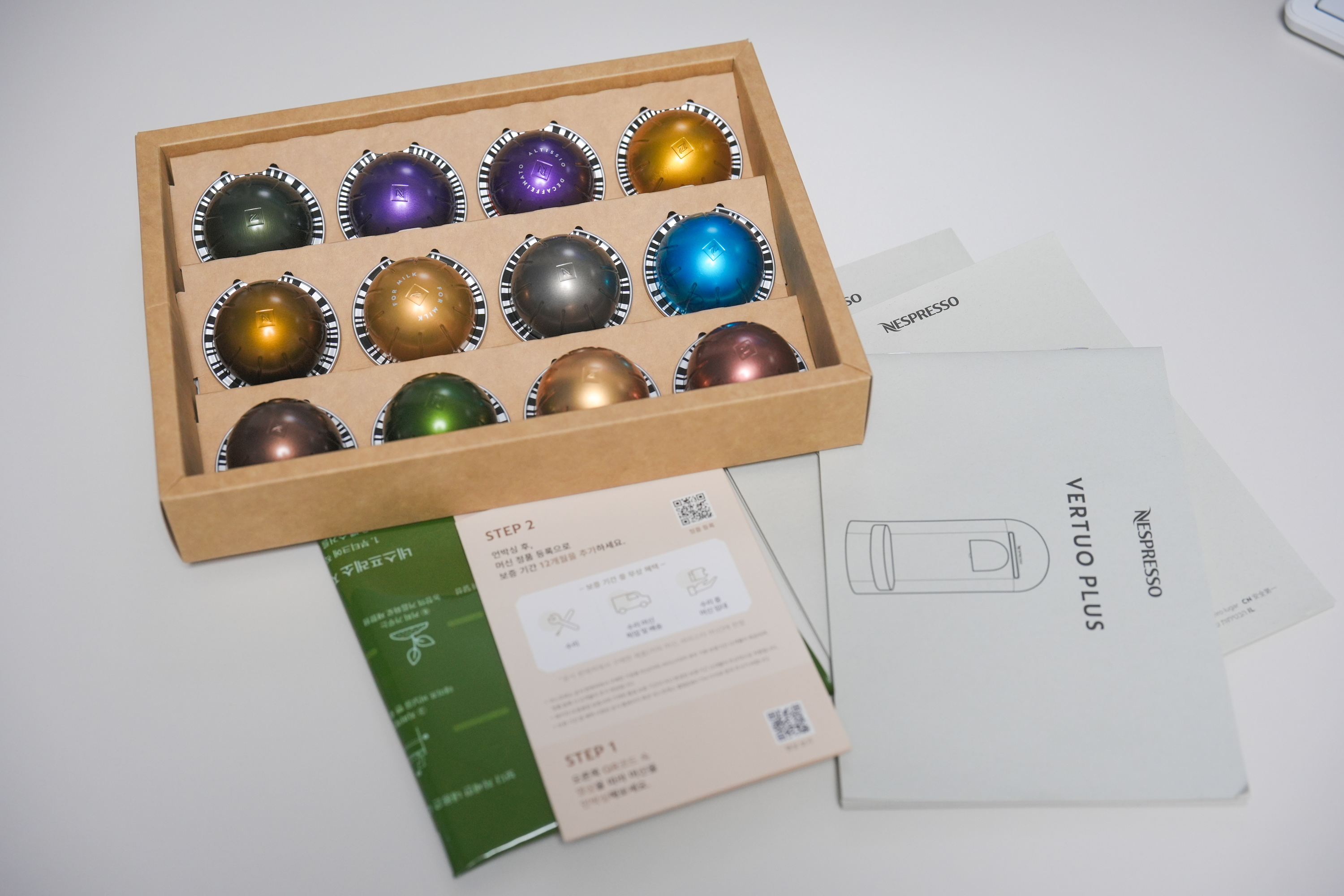 머신과 함께 다양한 캡슐, 설명서, 캡슐 수거 봉투 등이 포함되어 있었습니다. 특히 12종의 웰컴 캡슐은 네스프레소의 다양한 맛을 경험할 수 있는 좋은 기회였습니다.
