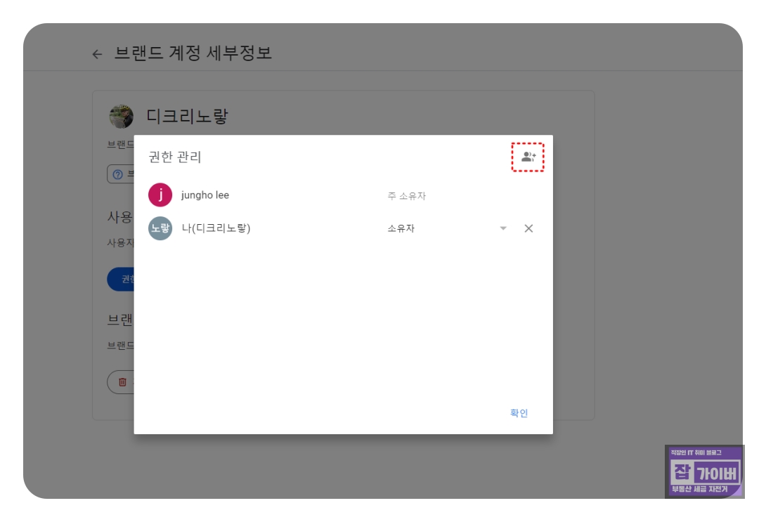 구글 계정에 로그인한 후 브랜드 계정을 선택하고, '권한 관리' 옵션을 클릭합니다.