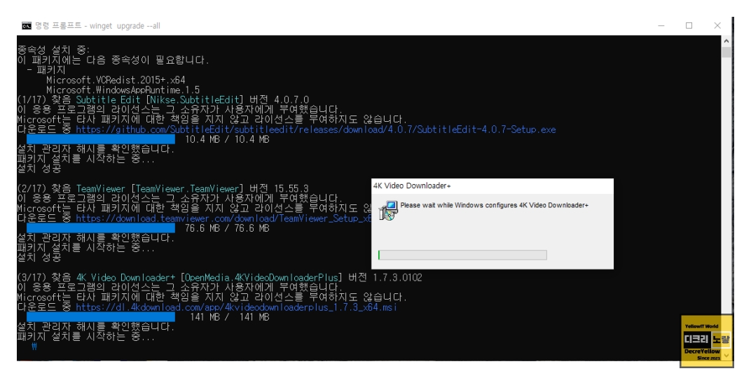 다음은 winget upgrade --all 명령어를 사용하는 예제입니다.