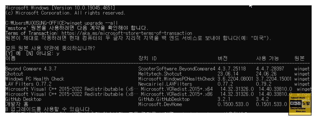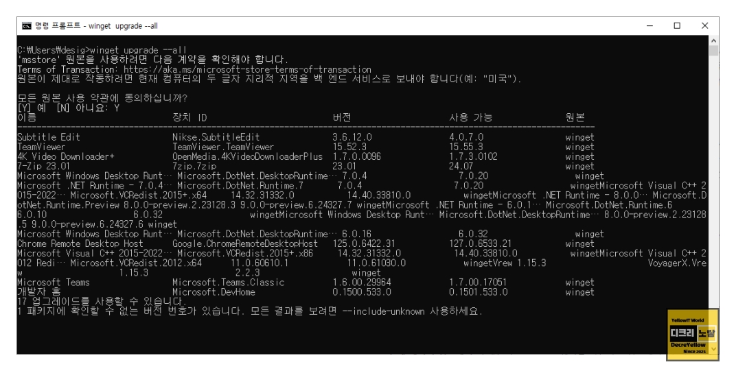 다음은 winget upgrade --all 명령어를 사용하는 예제입니다.