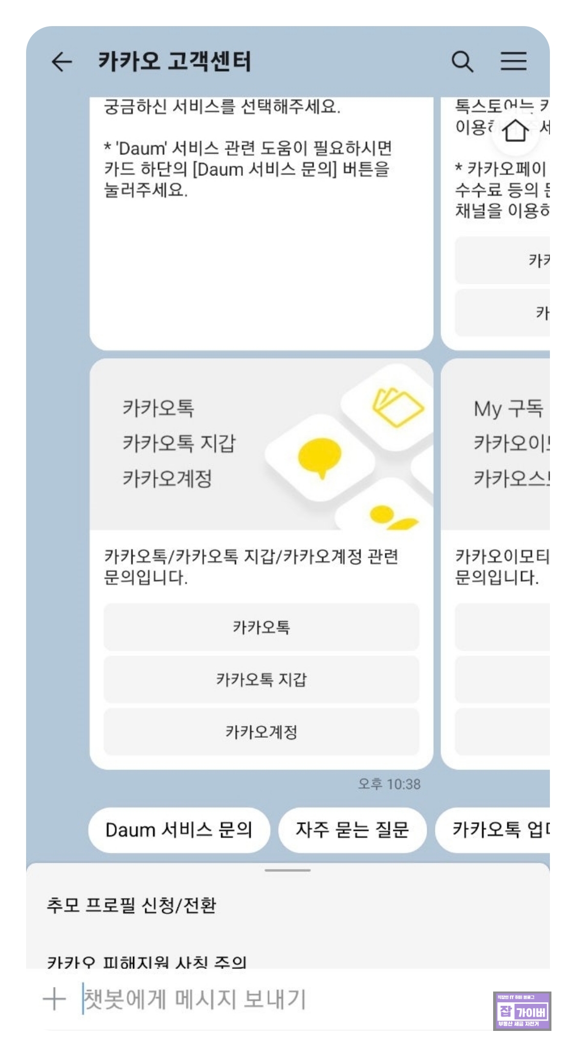 | 챗봇에서 '서비스에 문제 발생' 메시지가 나와요. 어떻게 하나요? | 챗봇 시스템 문제일 경우, 평일 오전 10시~오후 6시 30분에 상담원 연결 요청 후, 해당 메시지 화면 캡쳐를 함께 제출하면 빠른 대응이 가능합니다. |