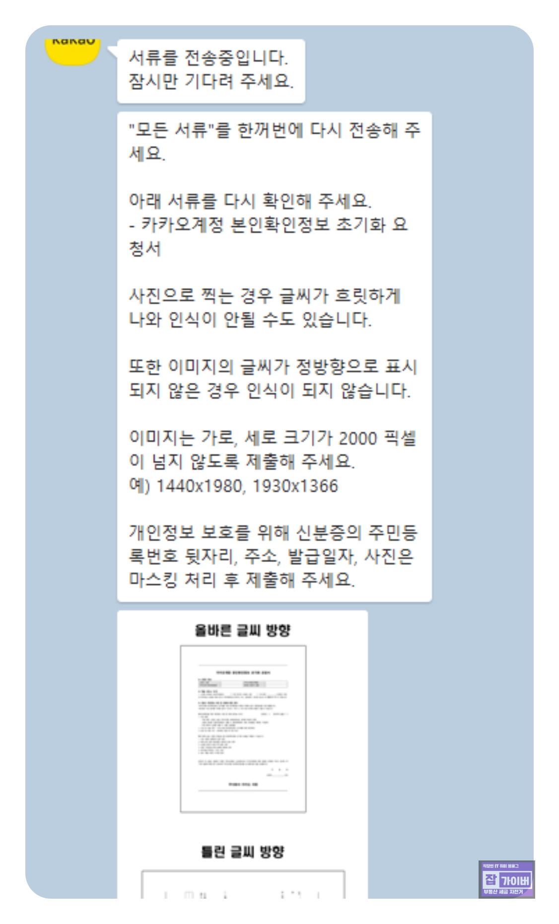 카카오 계정에 대하여 본인인증 초기화는 최초 1회에 한해 챗봇을 통해 안내를 받을 수 있으며, 다음 서류를 준비하여 제출해야 합니다.