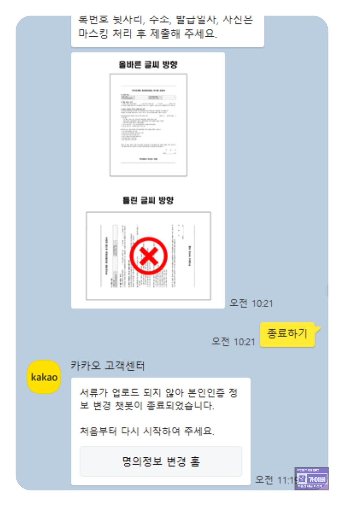 챗봇이 서류를 검토할 때 글씨를 제대로 인식하지 못하거나 파일의 크기, 이미지 방향, 개인정보 마스킹 유무를 판단하지 못하면 서류를 다시 제출해야 할 수 있습니다.