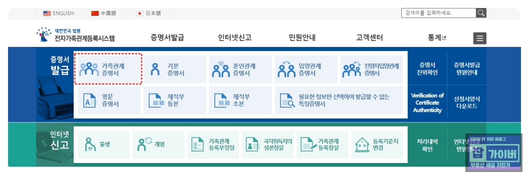 - 가족관계증명서: 가족들의 주민등록번호 뒷자리를 가린 상태로 발급