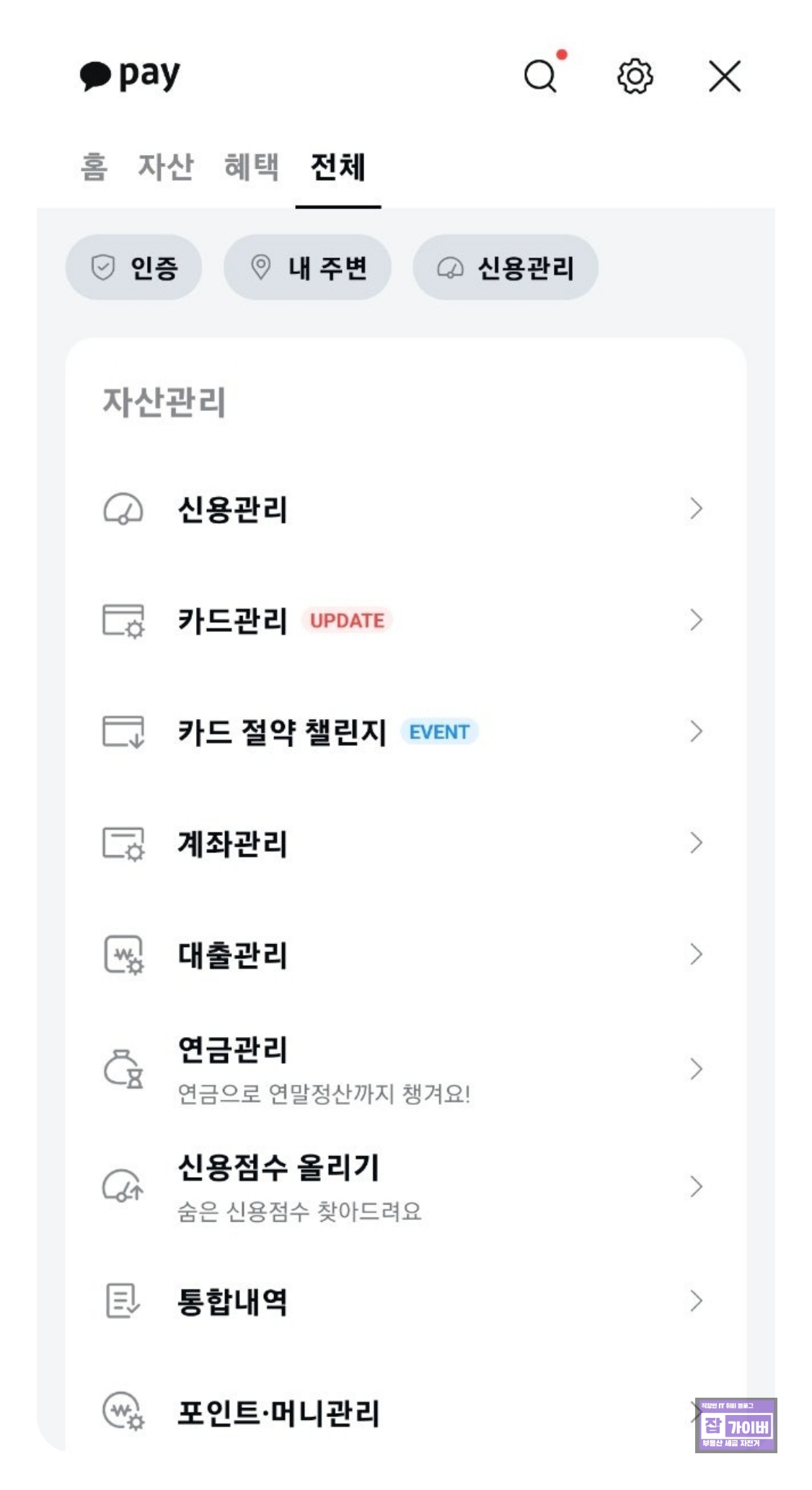 - 카카오톡 앱을 실행하고 하단 메뉴에서 점 세 개(더보기)를 선택 후 상단의 '지갑' 메뉴를 클릭하고 'pay'를 선택합니다.
