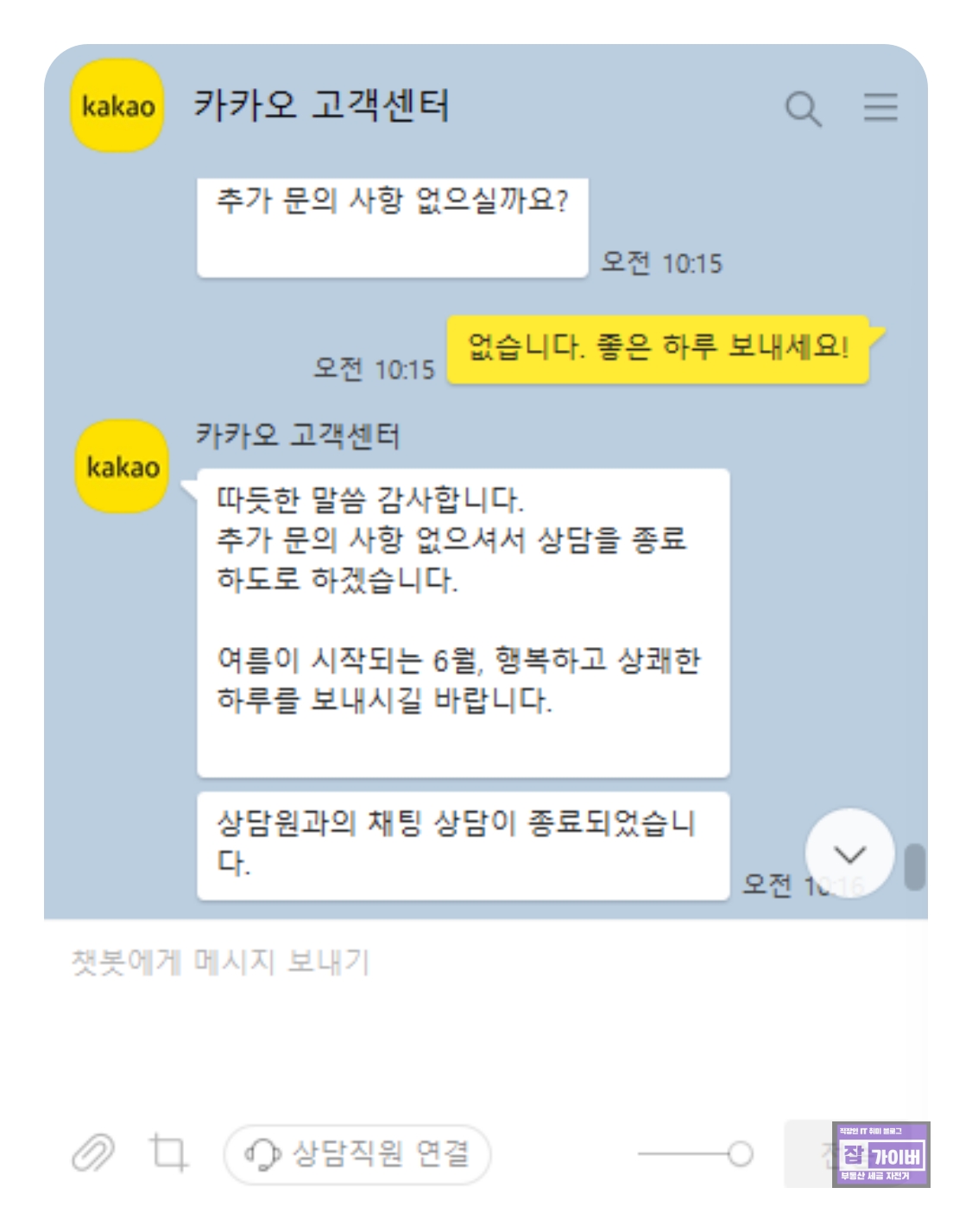 | 챗봇에서 '서비스에 문제 발생' 메시지가 나와요. 어떻게 하나요? | 챗봇 시스템 문제일 경우, 평일 오전 10시~오후 6시 30분에 상담원 연결 요청 후, 해당 메시지 화면 캡쳐를 함께 제출하면 빠른 대응이 가능합니다. |