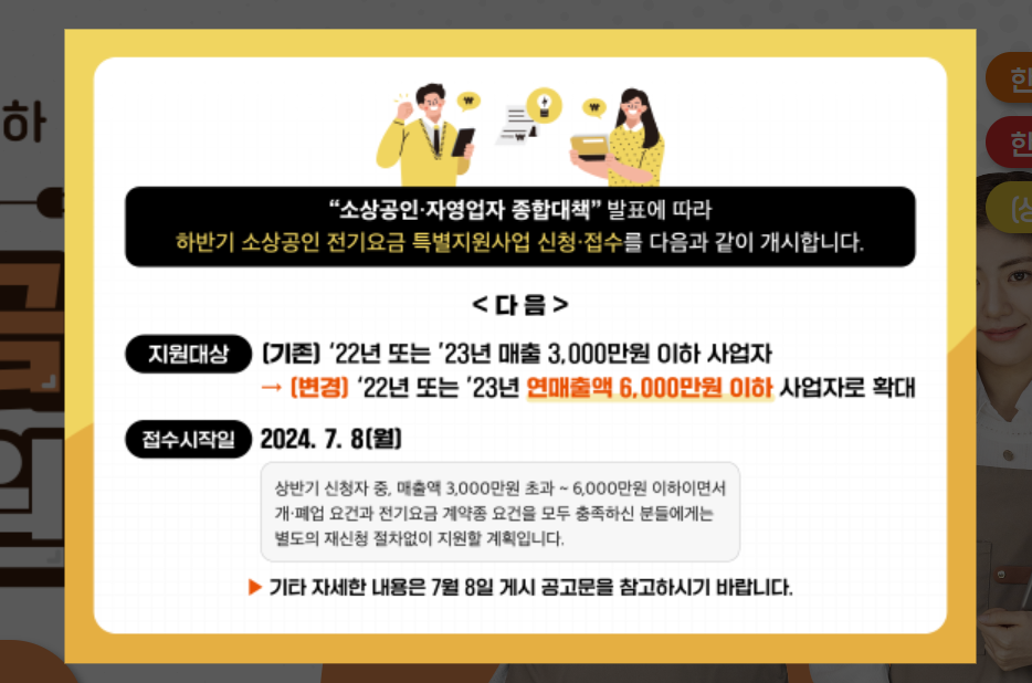 2025 2024년 개인사업자 소상공인 전기요금 특별지원 사업이 본격적으로 시작되었습니다. 2024년에도 어려움을 겪고 있는 영세 소상공인 및 자영업자를 위한 정부의 지원이 이어집니다.