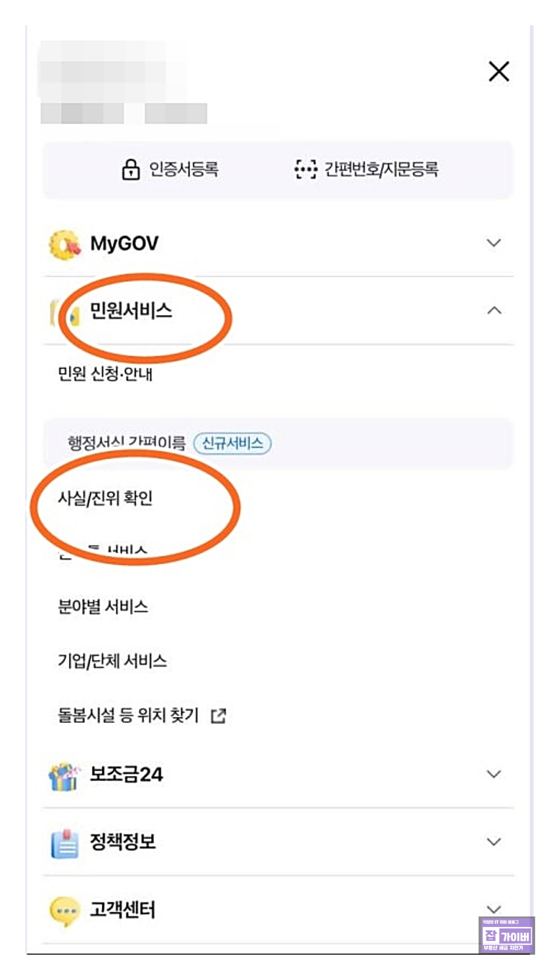 메뉴 버튼은 세 줄 아이콘으로 표시되어 있으며 이 메뉴를 열면 다양한 서비스 옵션이 표시되는데, '민원 서비스'를 선택한 후 '사실 / 진위 확인' 항목을 클릭합니다.