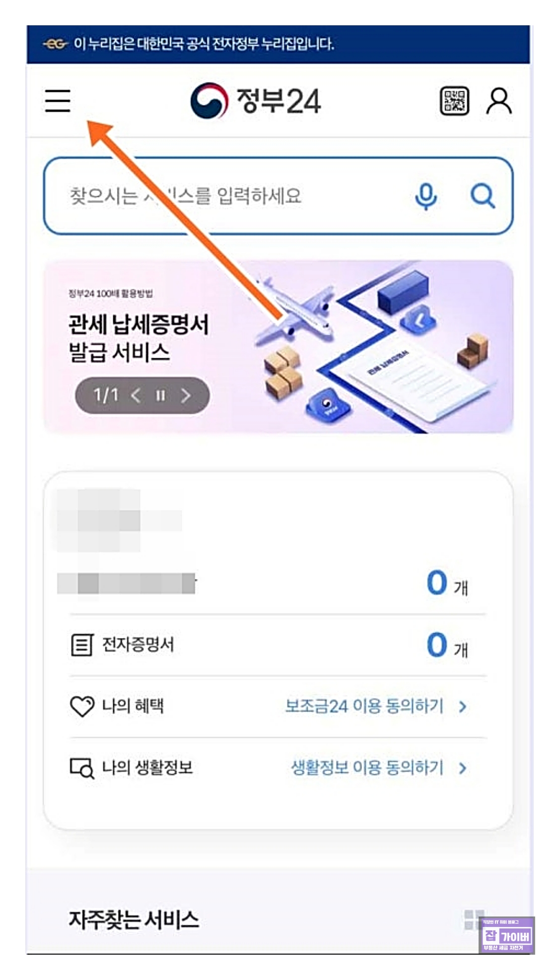 정부24 앱을 통해 이 정보를 확인하는 방법 먼저, 앱의 메인 화면에서 좌측 상단에 위치한 메뉴 버튼을 클릭합니다.