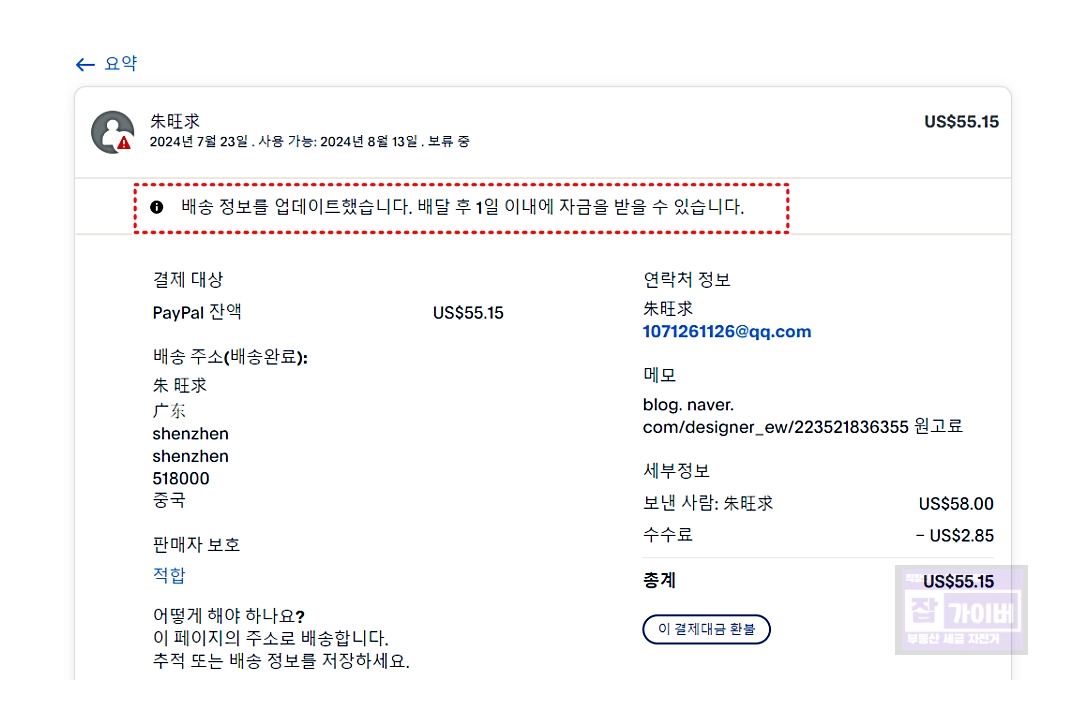 그럼 송금자가 이메일을 확인하고 보류 중 메일을 해제하면 되며 그 외 주문 정보가 업데이트되었는지 확인 후 보류 상태가 계속될 경우, 페이팔 고객 지원에 문의하거나 추가 지침을 따릅니다.