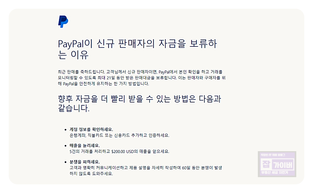 - 신규 판매자 계정: 페이팔은 신규 판매자 계정의 자금을 보류할 수 있습니다. 이는 계좌 정보 확인과 거래 기록을 검토하기 위한 절차입니다.