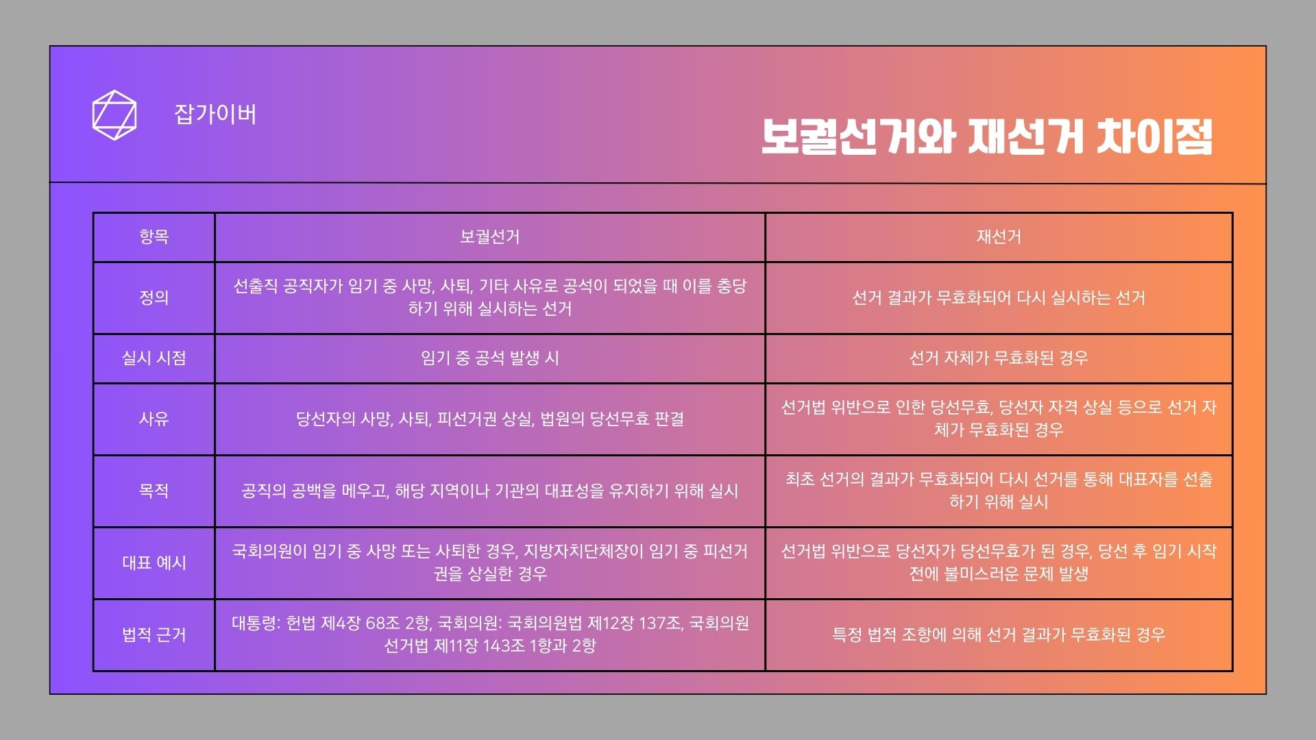 이번 포스팅에서는 보궐선거와 관련된 다양한 정보를 제공하고, 보궐선거와 재선거의 차이점에 대해서도 알아보겠습니다.