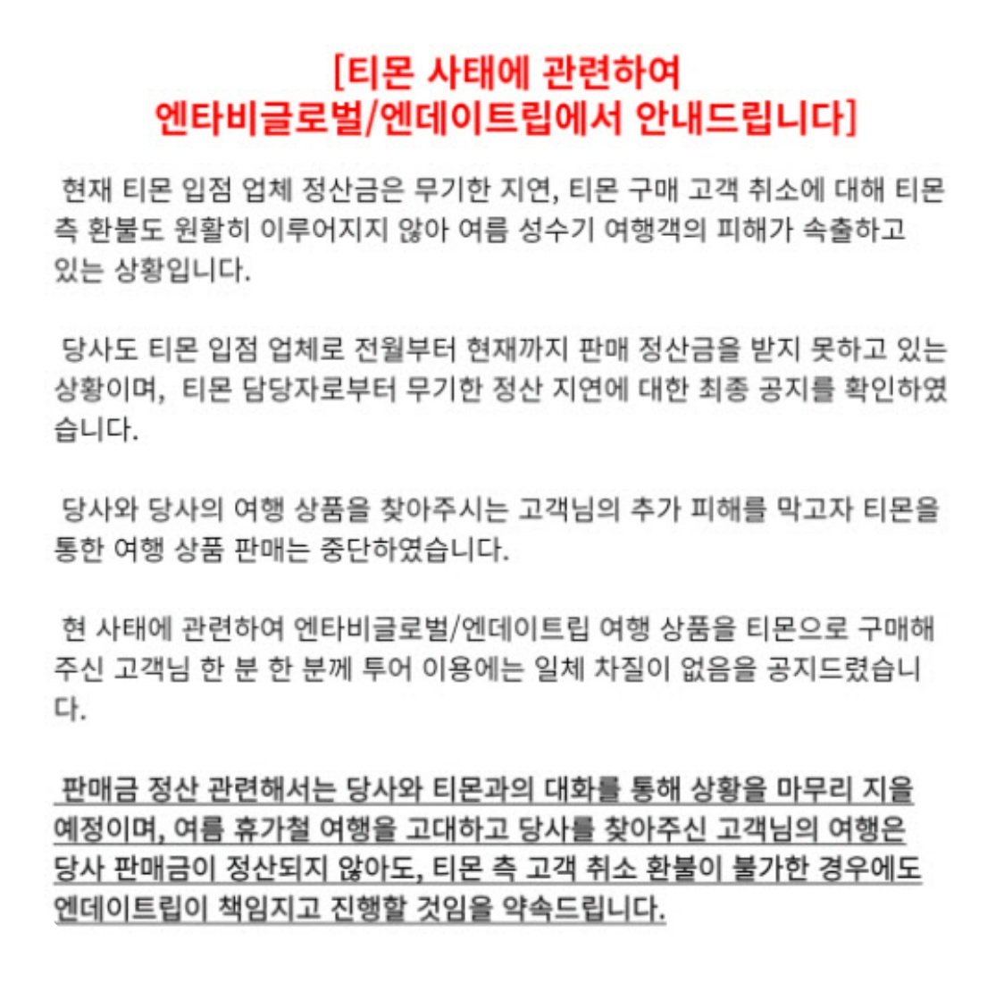 위메프와 티몬에서는 판매자에 대한 대금 정산뿐만 아니라 소비자 환불도 정상적으로 이루어지지 않고 있으며, 심지어 여행상품 및 여러 소비재 판매도 중단된 상태입니다.