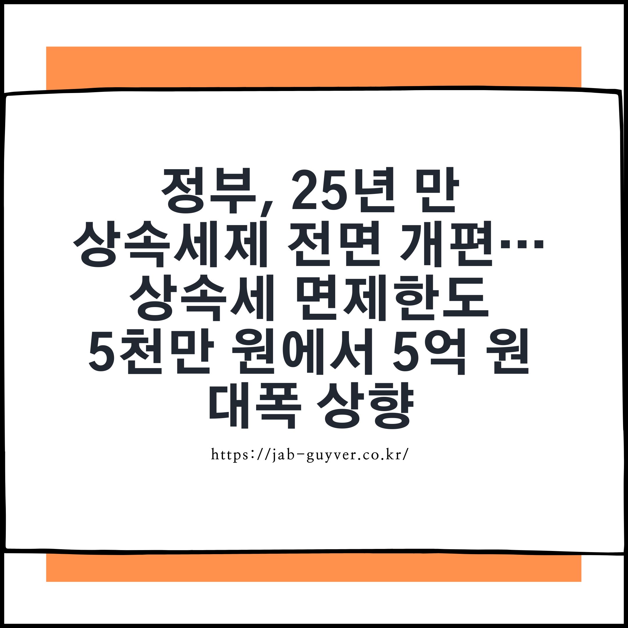 정부가 상속세제를 25년 만에 전면 개편하기로 결정했습니다. 이번 개편은 자녀와 배우자에게 상속되는 자산에 대한 세부담을 크게 완화하고, 결혼과 출산을 장려하는 방향으로 진행됩니다. 상속세 면제 한도를 5천만 원에서 5억 원으로 대폭 상향하며, 최고 세율을 40%로 인하하는 등의 조치를 포함하고 있습니다.