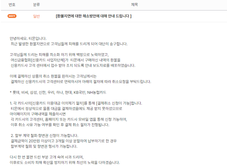 티몬 환불 지연에 대한 공지