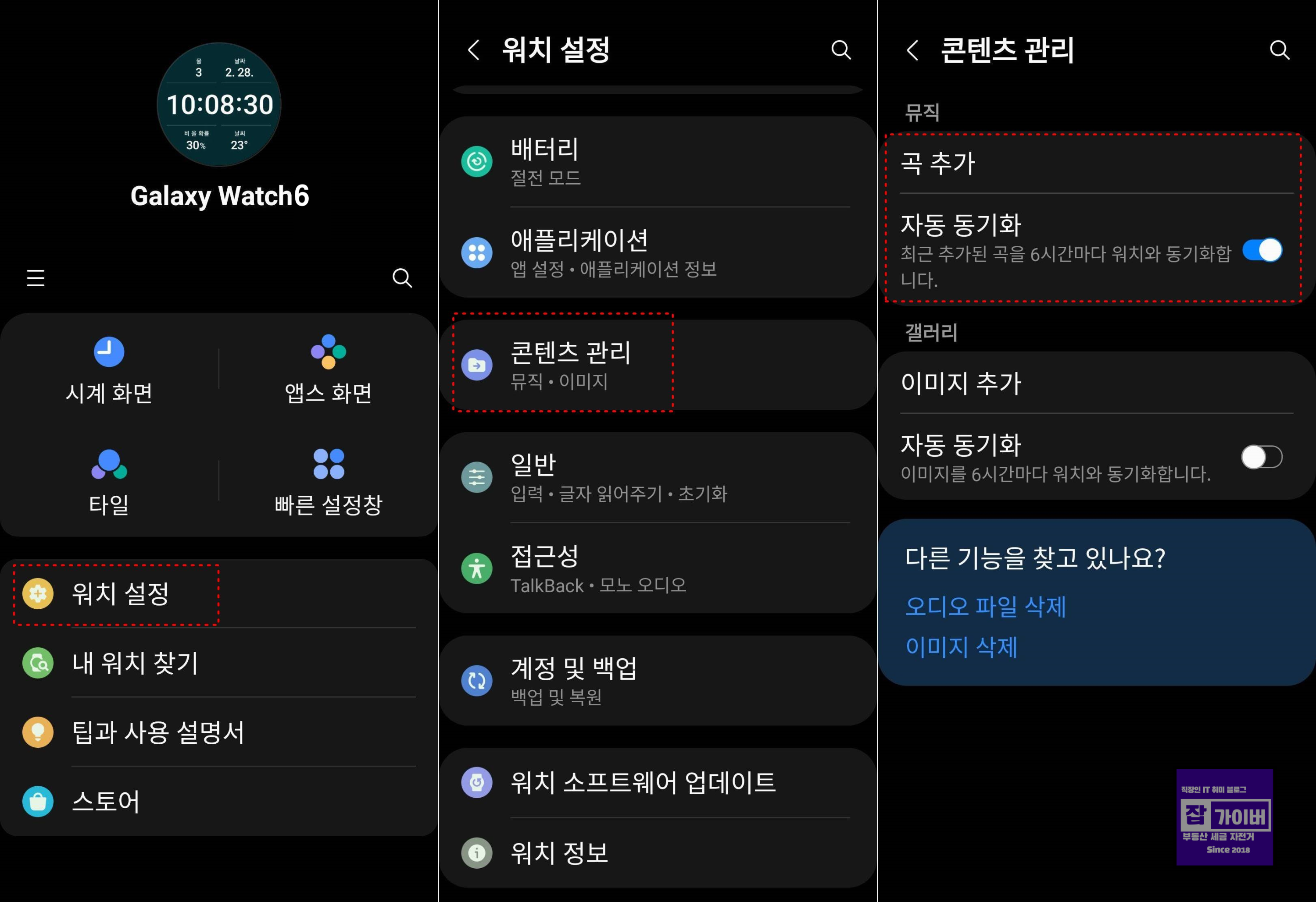 1. Galaxy Wearable 앱에서 '워치 설정' -> '콘텐츠 관리' -> '음악' 메뉴로 이동합니다.