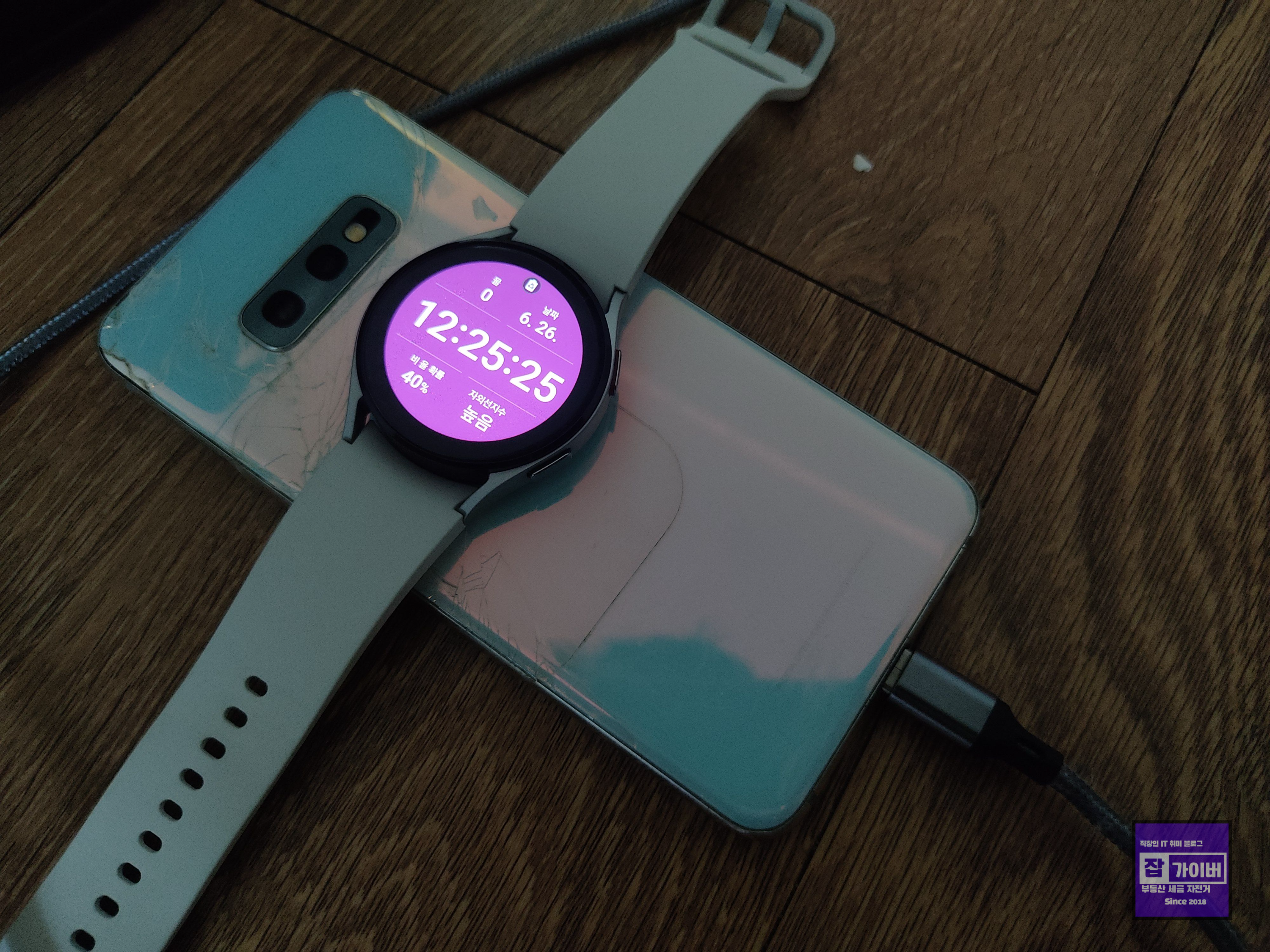 갤럭시 핸드폰의 무선 충전 및 배터리 공유 기능은 외부에서도 쉽게 워치를 충전할 수 있게 해주는데 생각보다 효율이 좋지 않고 발열 때문에 급한 경우에만 사용하느것을 권장합니다.