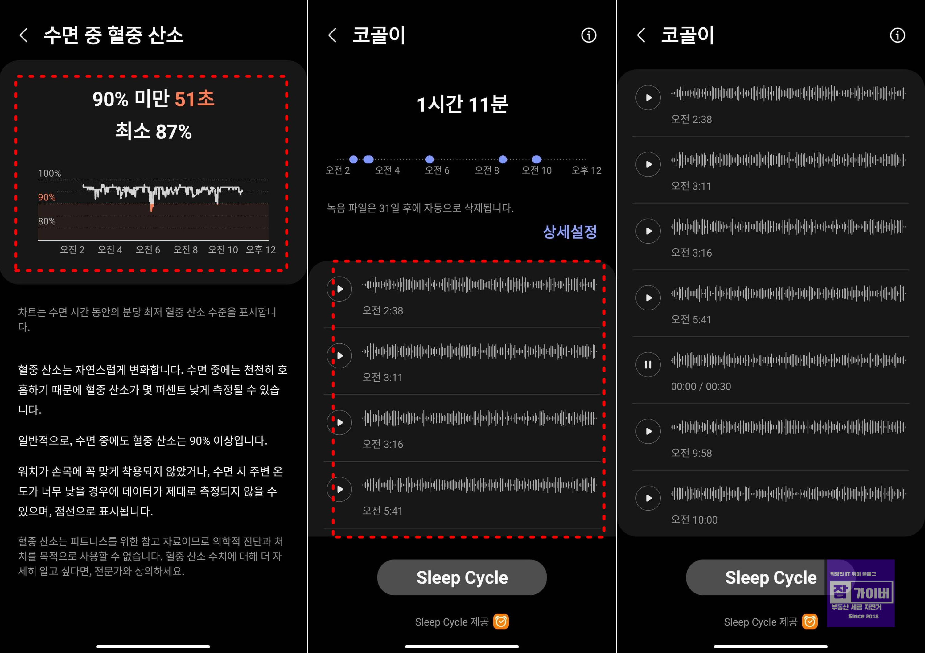 기본적으로 수면 측정 시 코골이 녹음해주고 수면 질과 함께 깨는 횟수, 깊은수면 그래프등을 보여줍니다.